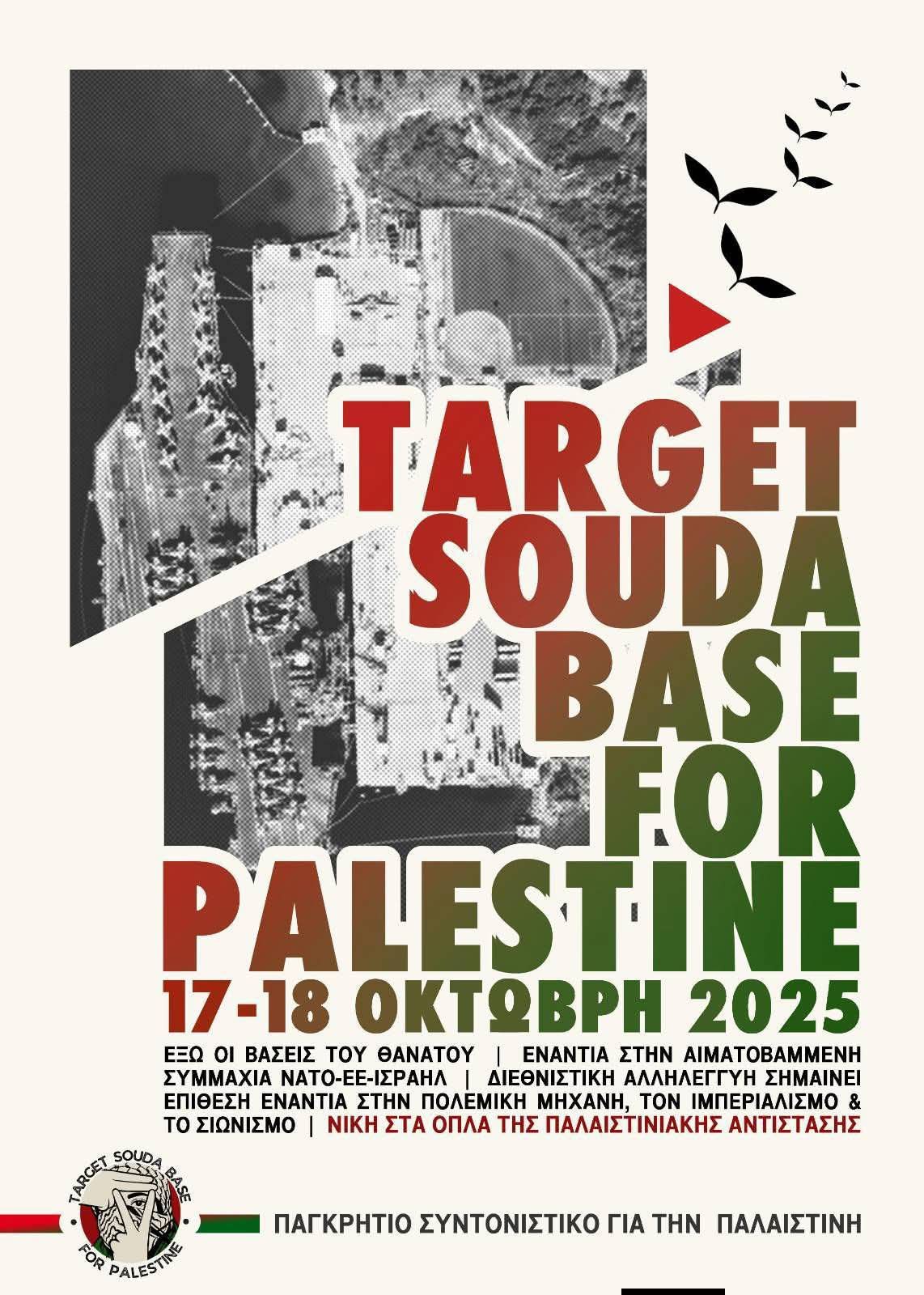 Πανελλαδική κινητοποίηση ενάντια στη βάση της Σούδας και τη συμμετοχή του ελληνικού κράτους στη γενοκτονία του Παλαιστινιακού Λαού | Βάση της Σούδας, Χανιά, 17-18 Οκτώβρη 2025