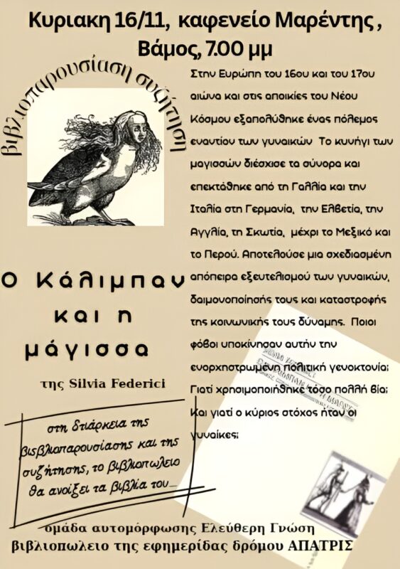 Το βιβλίο της Federici Ο Κάλιμπαν και η μάγισσα, που θα προτείνουμε και θα συζητήσουμε, ρίχνει φως στην καταγωγή της σύγχρονης πατριαρχίας που κατέστρεψε έναν ολόκληρο κόσμο υποκειμένων, πρακτικών και γνώσεων επειδή δεν συμβάδιζαν με την πρόοδο των καπιταλιστικών σχέσεων ιδιοκτησίας, εργασίας και αναπαραγωγής.